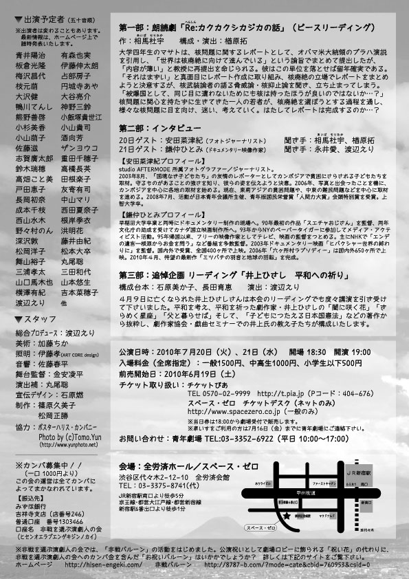 4月9日に亡くなられた井上ひさしさんの戯曲や様々な講演、著作から、平和への思いを語られた言葉で構成された朗読を行います。
